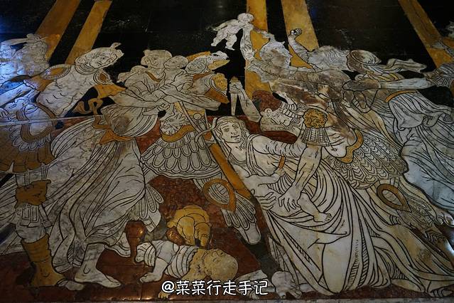 而最为叹为观止的是,我们所站立的地面,脚下共有56块巨大的马赛克地砖画,遍布教堂每一处,每块都是以圣经故事为主题,由40多位艺术家长年创作完成,平日里隐藏在地毯之下,全部打开每年仅一次,想象之下应该无比震撼。我们此次有幸亲见其中几幅,细腻入微,打磨光滑,表情分明,教人赞叹不已。皮科罗米尼家族图书馆(Libreria Piccolomini)是大教堂内的一大亮点,壁画极为壮观,缓步其中,瞬时拥有为艺术所环抱的幸福感。短短一个小时,怎么也看不够。