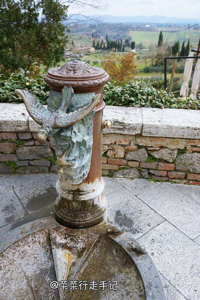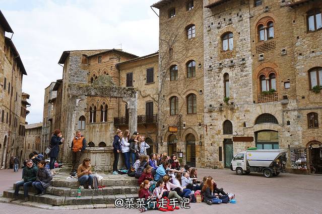 水井广场中央真是有一口大水井Cisterna,年代久远,是昔日重要的水源,如今仍是整座城镇的心脏,现在被铁网封住了,那古风架不住人们往里头扔大把的硬币来许愿。这究竟是什么习俗,怎么中外相通的?许多游客围坐在水井周的台阶上,悠闲地聊个天,吃个甜筒冰淇淋。我印象里的意大利人的生活就是如此,很多的城市广场,很多无所事事的人。