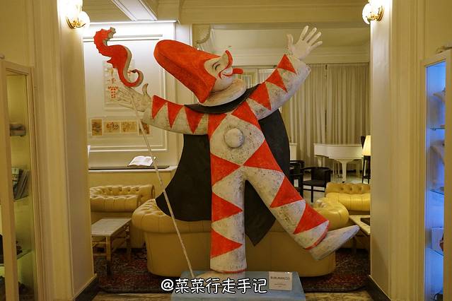 等待领队安排房间的当儿,我环顾酒店内部的陈设,发现这家酒店似乎以一个“象征人物”为傲,呈现于许多细节之中,橱窗里陈列着有关象征人物的素描和说明,还有一些印着图案的小纪念品,最为突出的便是大堂中央一副讨喜的塑像。我饶有兴致地打量,他明显是个小丑,带着滑稽的红色高帽子,红白三角纹的连体衣,画了红色的鼻子,顽皮地将舌头吐出,做着趣怪的表情,右手握着一支海马作头的长棍,手舞足蹈的样子。我看了看指示牌,他还有名字,叫做“burlamacco”。他一定是这家酒店的吉祥物,我当时仅仅这样想到。