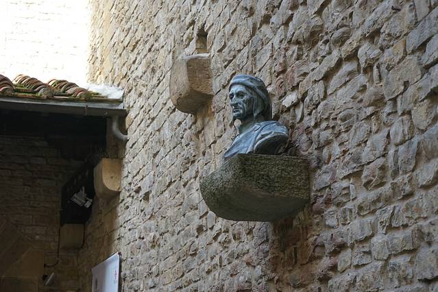 边走边看,不多时来到但丁故居。但丁博物馆在不远处。我们绕到建筑侧面,但丁的半身雕像安置在突出的墙面上,棱角分明的脸庞,冷峻的目光看着世界。地陪提示我们看站立的脚下,有趣的是地面的确有一块地方较为光滑,周遭的坑洼石板突出了这一效果,明显能看出是一张人物侧面像,“是但丁吧?”我们猜测道,在地陪那里得到了证实。我本来以为能进去参观的,哪知只是在外面晃一圈,随即就离开了。