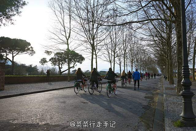 另一种游览卢卡的方式就是走城墙上(类似西安),保存完好的古城墙内外是光影的变幻,城墙上的我们则是逍遥的自在。卢卡城墙共有五座城门,墙上有10座炮台,古时御敌之用,建于16-17世纪的城墙总长4公里,有“欧洲保存最完善的文艺复兴时期工事”之称,这座城墙刚建成时城墙后面一大片的空旷地,据说是为了防止敌人利用树木和植物伪装。但是幸运的是,城墙从未遭遇正面攻击。