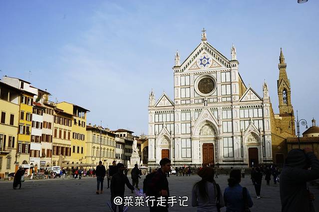 圣十字圣殿(santa croce)是世界上最大的方济各会教堂,其中的小圣堂都装饰着乔托及其学生的壁画创作。在这座教堂中,安葬着许多广受尊敬的意大利人,例如“文艺复兴三杰之一”的米开朗基罗、科学家伽利略、政治家马基雅维里等等。我查了资料,大文豪诗人但丁实际没有葬在这里,但后人出于对他的尊敬,专门树起他的雕像。