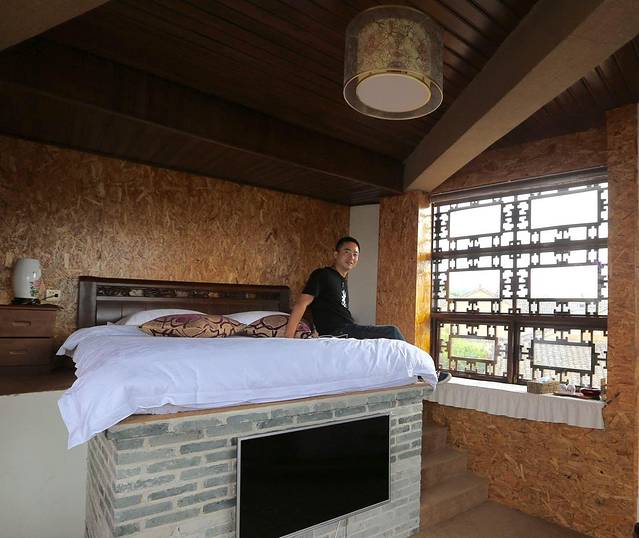 客栈的老板是江苏人,很年轻。在电话里我们早已熟识。客栈的每个间房都不尽相同,我今晚住的房间像一个高高的炕,担心的是我会不会梦游中从高炕上滚下来,若是那样场景一定惨不忍睹,老板笑说我多虑了。很惊喜窗外望出去满目绿意,田园风光在此炕上尽收眼底。