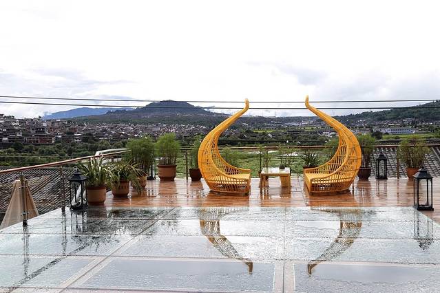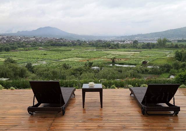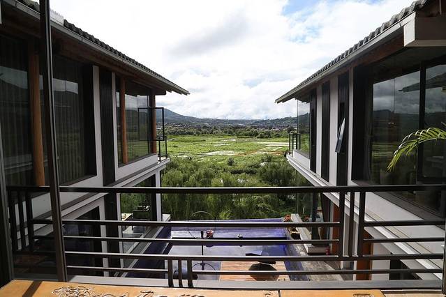 海晏堂客栈共分三层,全部客房也才八间,刚才我进门的大堂其实是客栈的二楼。整个客栈呈英文的U子型建造,“U”的开口部分就正对着和顺古镇最开阔的湿地。坐在二楼的大堂里。依着沙发,就能一览无余地眺望和顺古镇的湿地、民居,视野极好。