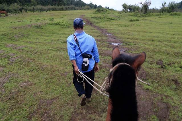 分了两组上火山,一拨步行,一拨骑马。黑曼巴率先挑了匹回头率颇高的高头大马,而迎接我的是像毛驴一样的本地矮脚马。笑容可掬的马夫接住我的“小白”挎肩背上,尽管我不太喜欢骑这匹“武大郎”,也不好意思再去另换坐骑了。