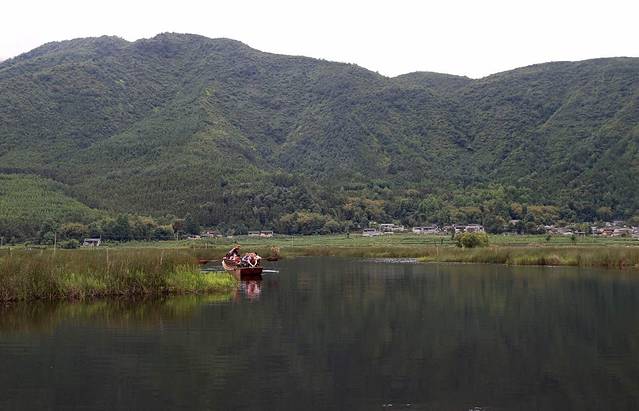 我们摇着木船荡漾在湿地的水面,船桨拍打着湖水撞击着船身,声音清晰入耳,身后留下一圈圈由深至浅的水纹。