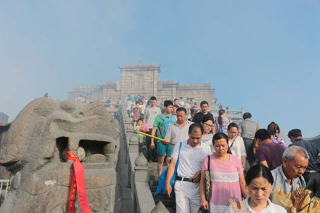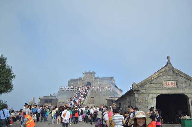 到了祝融殿,右边的“南岳衡山”都是抢着拍照的人。我们自觉排队拍照,途中因为有个别游客不排队,都得到其他群众一直的炮轰。可见现在个别游客的素质真不怎么样,但是也感觉到大家一致舆论声讨的威力。