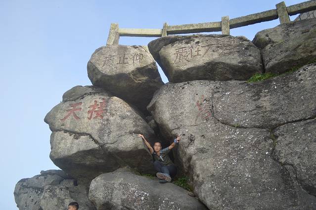 继续往上爬,来到一处观景平台,刻有“南天石柱”几个大字,果断合影留念。