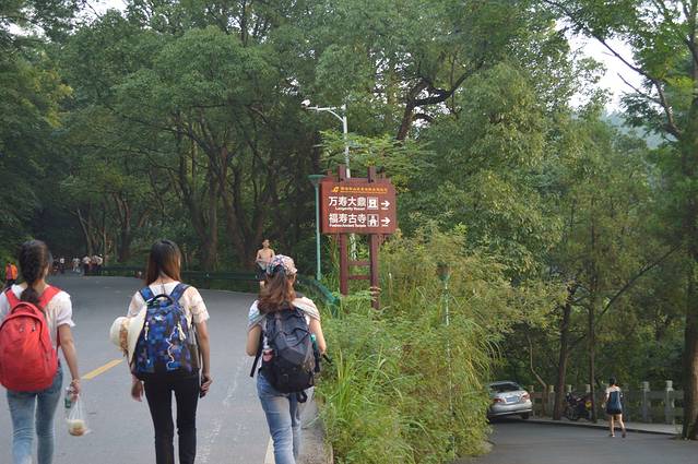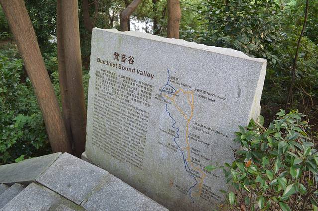过了检票口,一边是行车上山的公路,一边是步行路线,写着“梵音谷”。