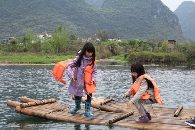 然后开始的是漓江漂流,是从淘宝上预订的漂流,140一人加上40一个的空位费一共花了360元。