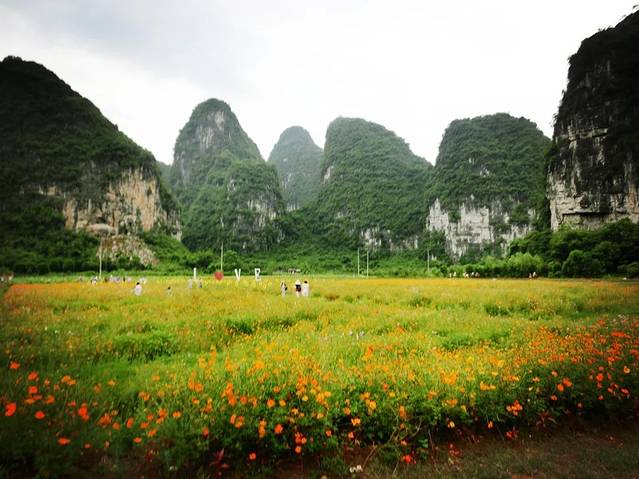 骑车从阳朔游十里画廊的路上会有很多当地人在路边种花 格桑花 向日葵 荷花 门票应该都是10块一个的