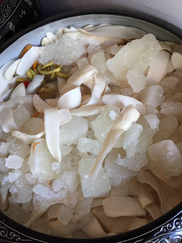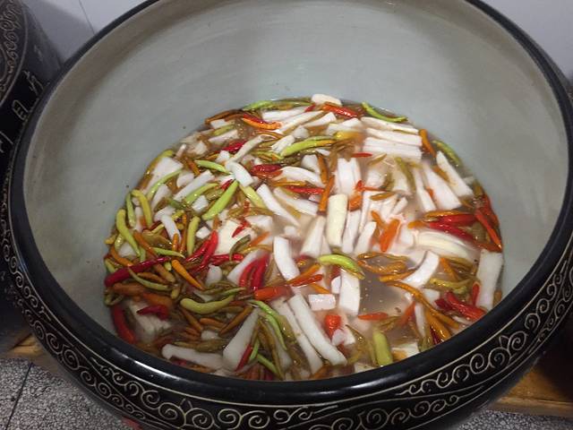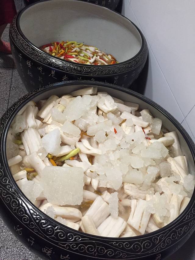 朋友介绍到芷江一定要买酸萝卜,芷江酸萝卜有两家名店,一家是龙津风雨桥附近的”唐姐酸萝卜“,听说上过中央电视台;一家在万和鼓楼附近,叫谭式酸萝卜。两家我们都品尝了,更喜欢第二家的,不论环境、规模、人气都更胜一筹。谭式酸萝卜酸甜爽口,吃第一口没有什么惊艳的感觉,但越吃越爱,根本停不下来。老板说每一缸放入的冰糖成本都有100元多。