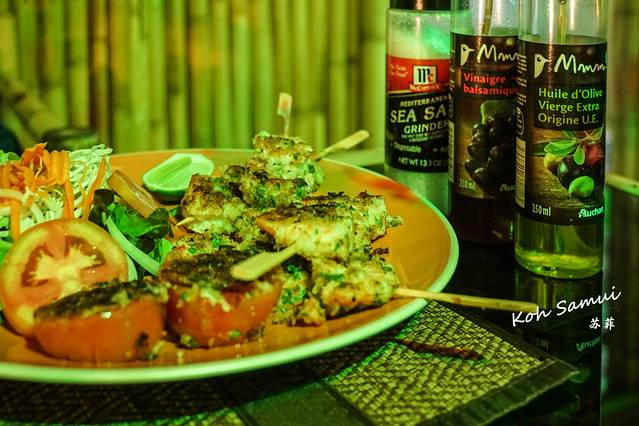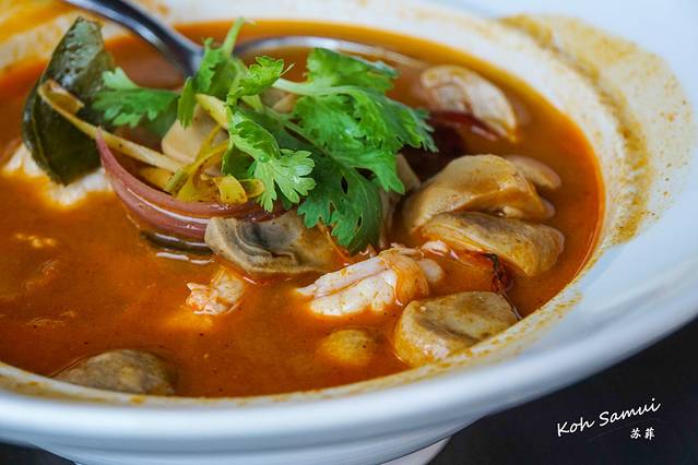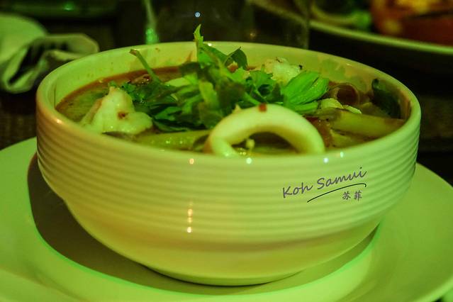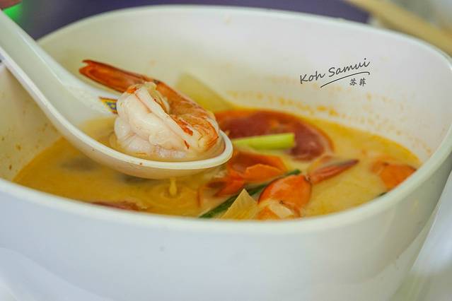冬阴功汤。小小的一碗汤里,竟然有着6、7只大虾。大虾相当地新鲜,汤的味道也酸辣度适中。后来我老公点评说这是我们这一程在苏梅岛吃到的最好喝的冬阴功汤。