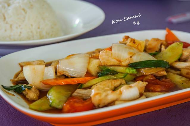 本地鸡肉炒时蔬,有点像我们宫保鸡丁的口感,再加上一点点的酸甜,佐饭刚刚好。