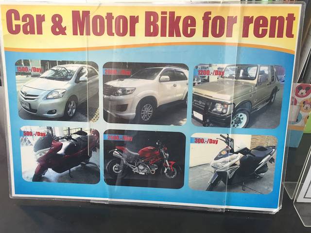 在宜必思酒店的前台就有租车柜台,在这里租一台摩托车或者小车,每天不过300-2000铢(如需婴儿座椅也可以要求提供)。租车的手续也相当简单,出示护照,签一纸合同,即可,连驾照都不用提供。