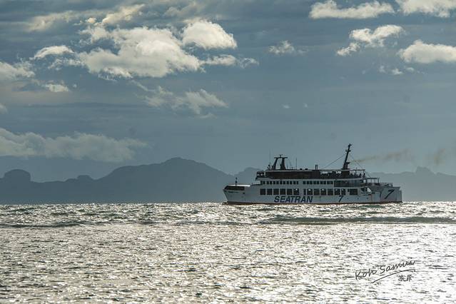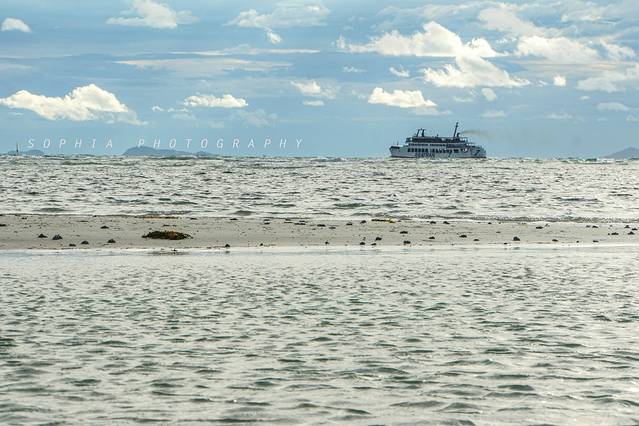 旁边的码头不时驶出开往周围离岛的渡轮。轮船在海上鸣出悠长的汽笛声,打破了周围的宁静,随即又渐行渐远,连水花声都随之带走,让周围显得更加安静。