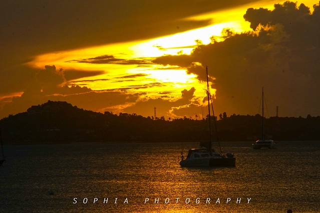 这一天的云层还有些厚,那朝阳仿佛犹抱琵琶的美女,腼腆而羞涩,仅仅露出纱巾后的那一双碧眼。霞光偷偷地从云层后面探了个头,一抹光便给那云镀了一层金边,带着少女的矜持,微微点亮了海上的白帆。
