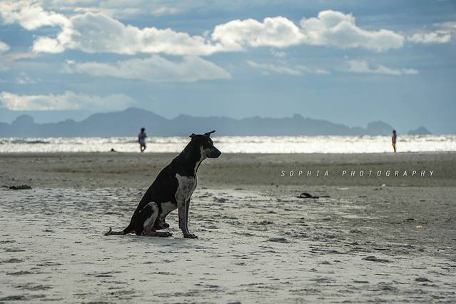 这只黑白相间的狗,一直安静地坐在滩涂上,似在等待谁。难道它也在等待日落的那一刻,等待夕阳将金色的光芒洒向自己?