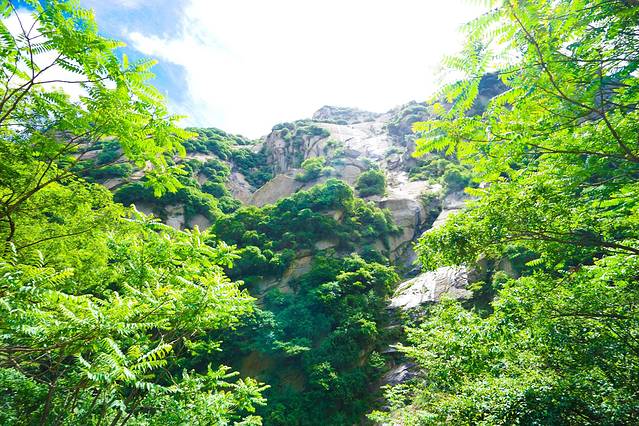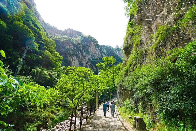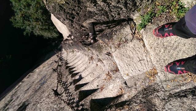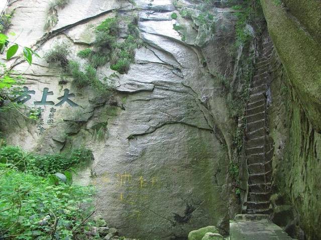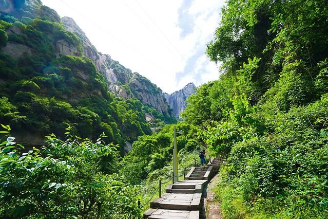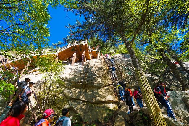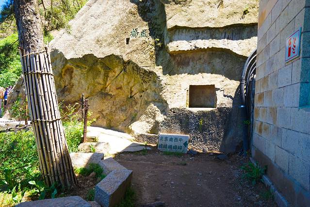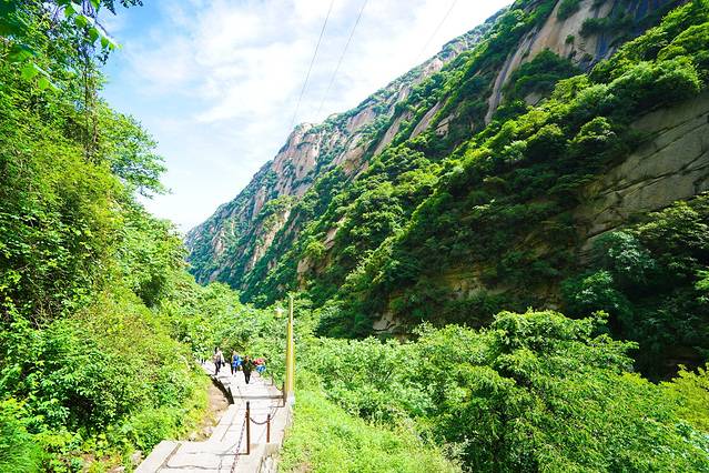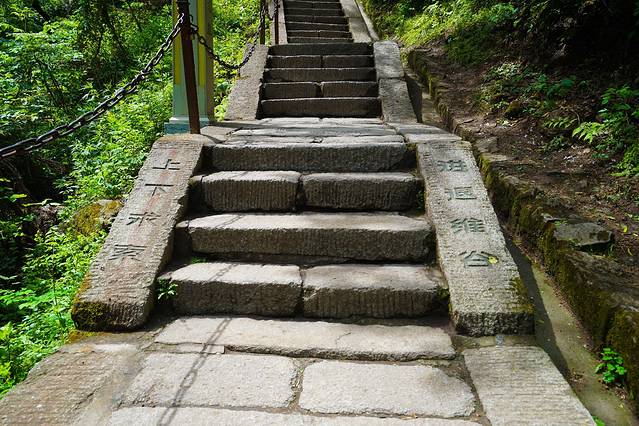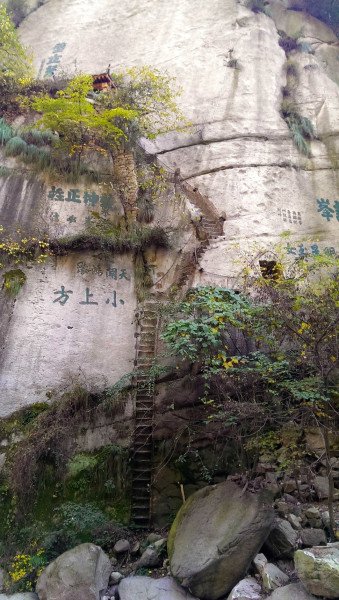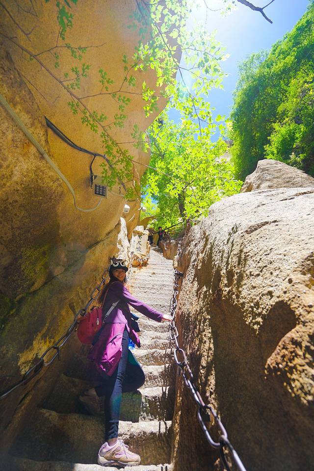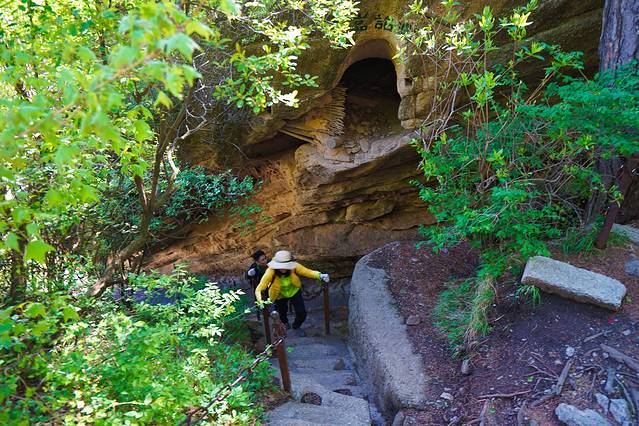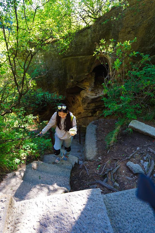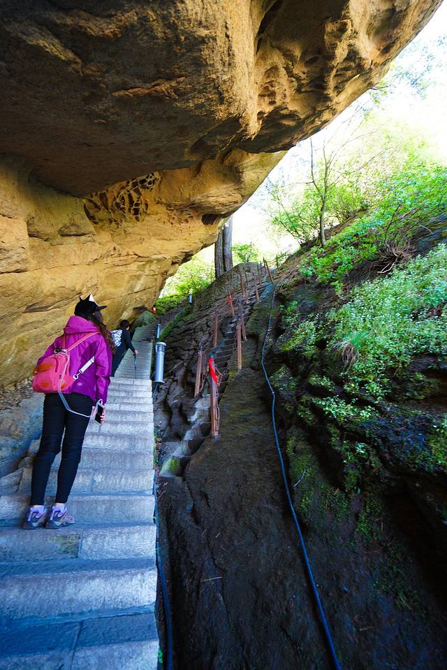 岩下有两条道路,右侧是古道,狭窄陡峭,左侧是新开凿石阶,平坦好走。我们连长空栈道都挑战了,还在乎这个吗?直接走古道啦~很快就上来了难度不大。