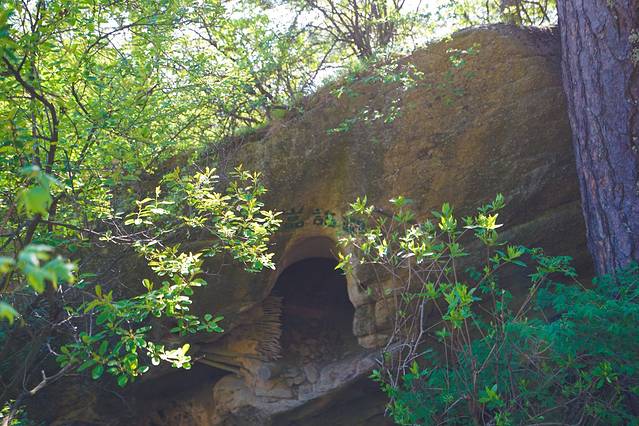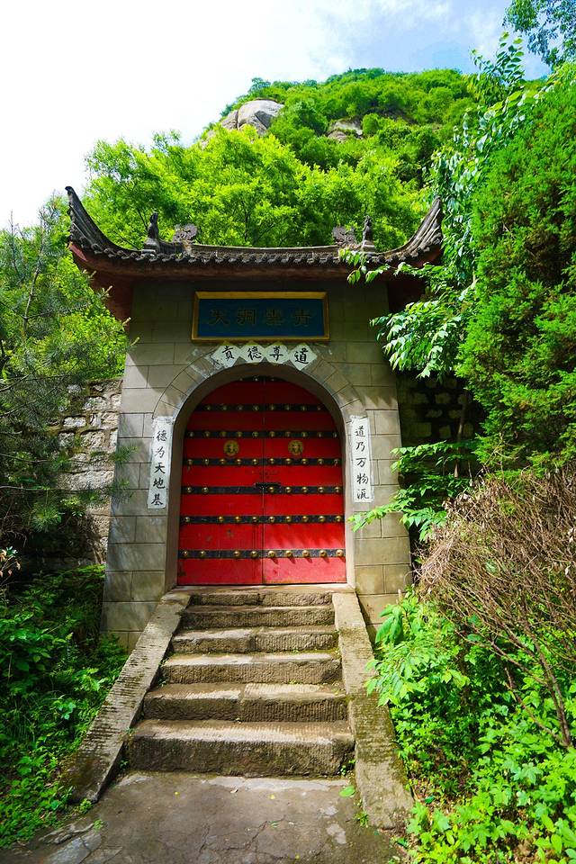 “莲花洞,为”一馒头形巨石,高约十米,为花岗岩球状风化体。由于雨水冲蚀,岩体上布满皱纹,从远处欣赏,全石酷似一朵含苞待放的莲蕾,蕾上覆盖一片形石,像一面巨大的荷叶。巨石下东侧有石洞,便称莲花洞。开凿于明嘉庆元年至六年(1522-1527)是陕西西安府同州郃阳县仁义梓里出家的道士所开凿,可惜开洞道士的名字被人凿毁。洞深广约二十平方米,洞内周壁原塑有三十六天尊神像,为原在洞中修持的道士王遇真所营造。神像色彩绚丽,造型生动,已被毁。洞外石壁题刻很多,有“金天重地”、“莲花世界”、“屏镇西天”、“翠峰射日”、“太乙莲台”等,楷隶草篆,琳琅满目,堪称露天书法展览。