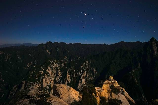 吃饱后,离开西峰饭店,晚上的华山是有路灯的,方便夜爬。于是带着的头灯和手电筒也用不上了。跟着小蝶走了正确的捷径,20分钟左右就回到了东峰饭店。