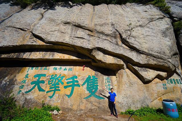 除了饭店正门,才发现眼前的石壁上,写着“朝阳峰”三个字。