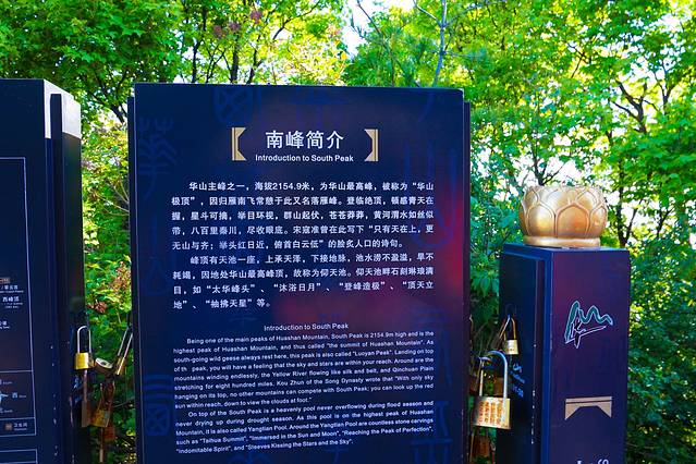 南峰石碑旁边还有一个丢满钱币的许愿池,写着:此处乃道教圣地,上承天泽,下接地脉,池水常年旱不耗竭,涝不盈溢,是华山灵气汇聚之心,千百年来无数人池前许愿,终如愿以偿。