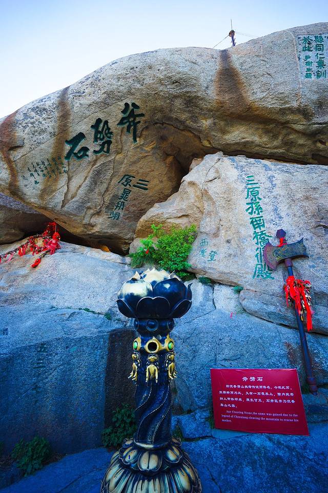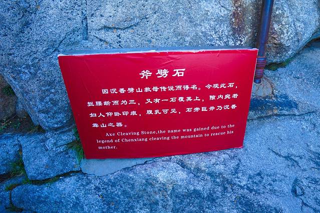 上了台阶,看到了“斧劈石”。《宝莲灯》中那个勇敢的小沉香劈山救母的故事发生的地方就是在华山西峰。传说玉皇大帝的女儿三圣母因爱慕书生刘彦昌的容貌才华,私结连理。二郎神杨戬以违返天条罪将三圣母压在西峰巨石下。三圣母石下产子,取名沉香。长大成人受仙师指点,执神斧劈开巨石,母子团圆。