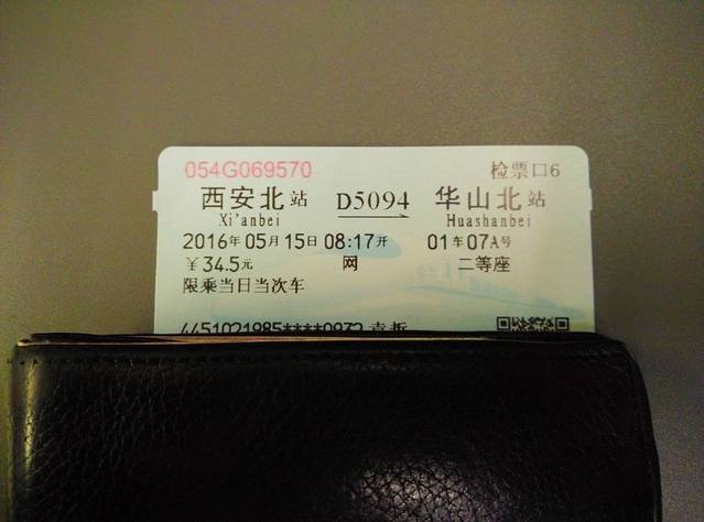 飞机定好后,开始安排其他的交通。其中主要的交通,就是西安到华山的高铁订票了。经过了解,从西安市区到华山,最好的就是从西安北坐高铁到华山北。票价不贵,54.5,元,行程约40分钟。很顺利的用软件购买了来回的两张车票。