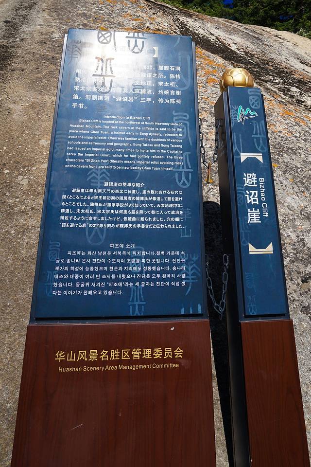 “避诏崖”在宋代前本无其名,史志记是古代隐遁之士藏匿珍贵典籍的地方。相传宋太宗赵光义曾多次派使者召陈抟老祖进京做官,而陈抟不愿做官,就躲避在此,并以“一片野心皆被白云留住,九重龙诏休教丹凤衔来”而回绝了宋太宗,方得此名,并成为华山的著名景观。