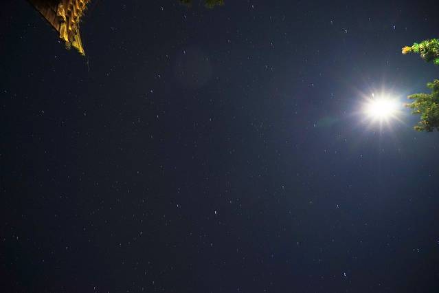 由于没有带三脚架,随便找了一块石头架着相机,拍下了头顶的一角屋檐和明月。