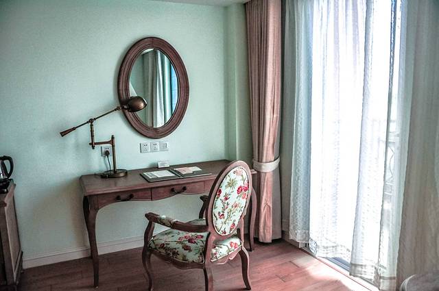 书桌和同款碎花椅。这里因为这个镜子第二天被我用于化妆了。