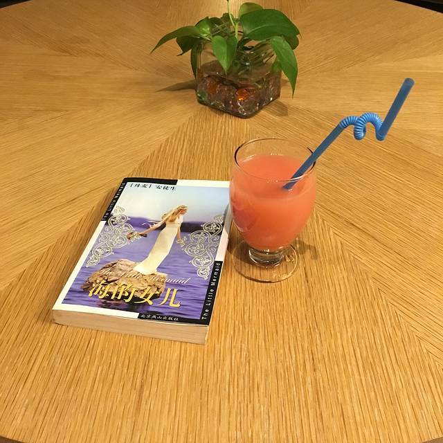 这个季节东港音乐喷泉的表演时间是七点半,我和老公都来早了,看见附近有一个鸟巢一样建筑的会议大楼一楼有个西餐厅,感觉建筑的挺特别挺漂亮的就进里面点了一杯果汁🍹,随意拿起书架上的一本书,一边看书一边喝果汁欣赏着窗外的夜景等待音乐喷泉的表演