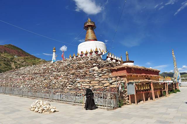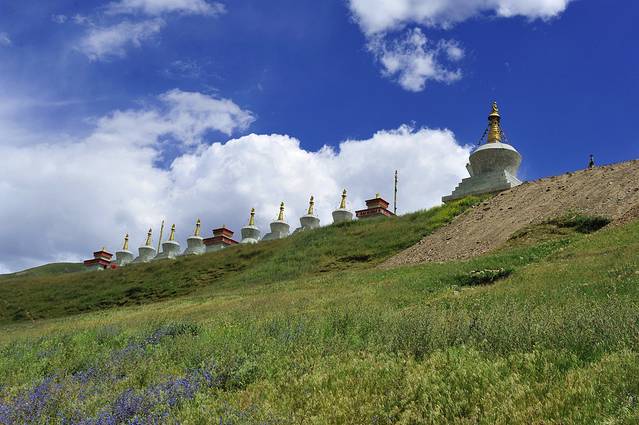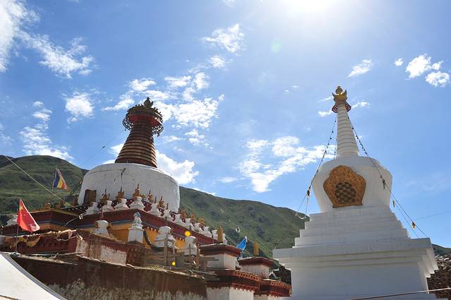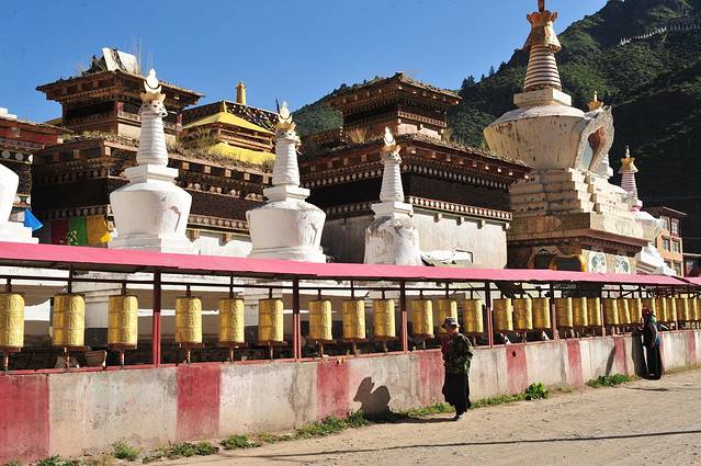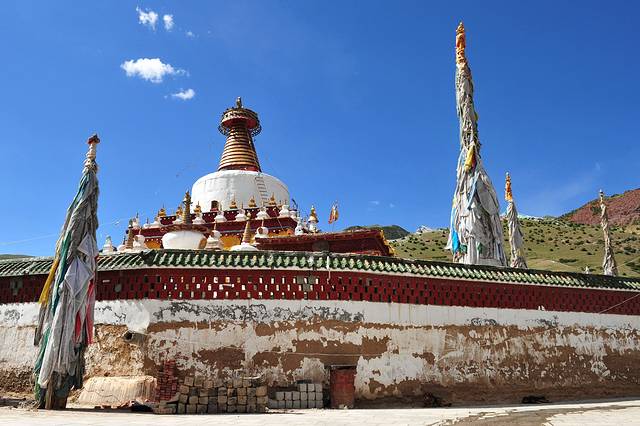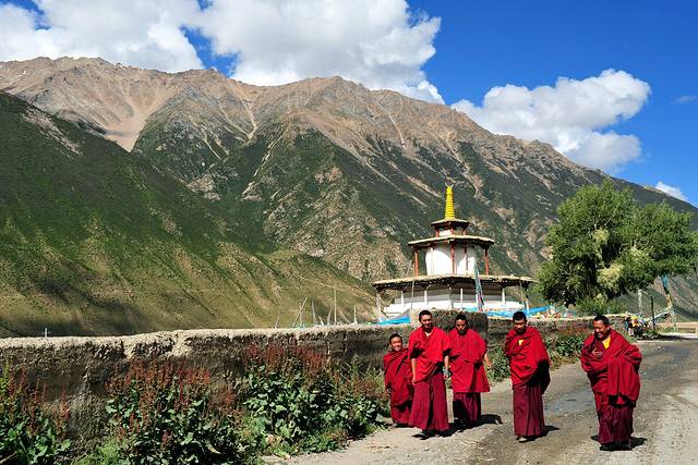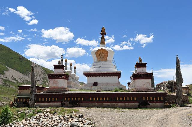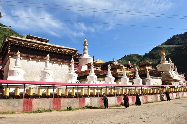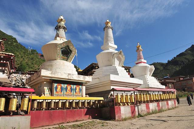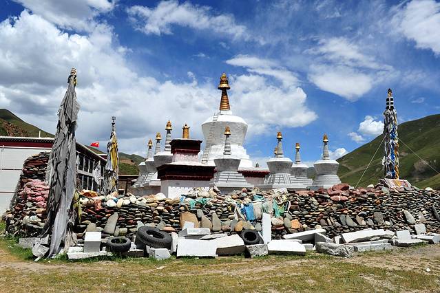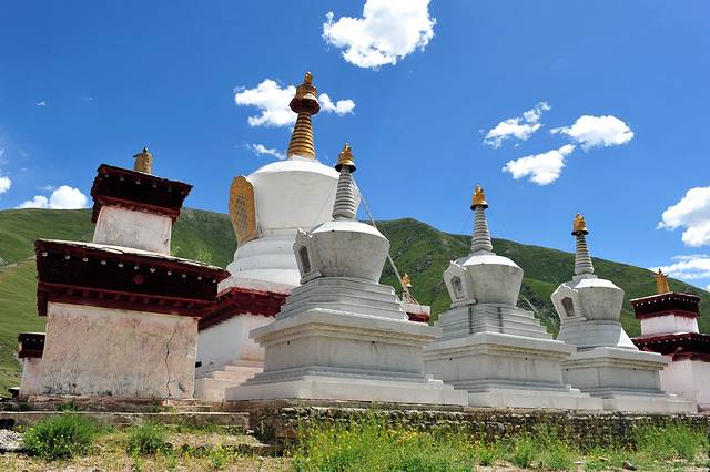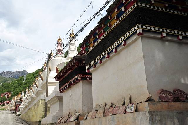 饭后继续回酒店休息,下午3点过后,太阳不那么炙热,才出门前往德格更庆寺。经过寺庙门前造型各异的白塔群。