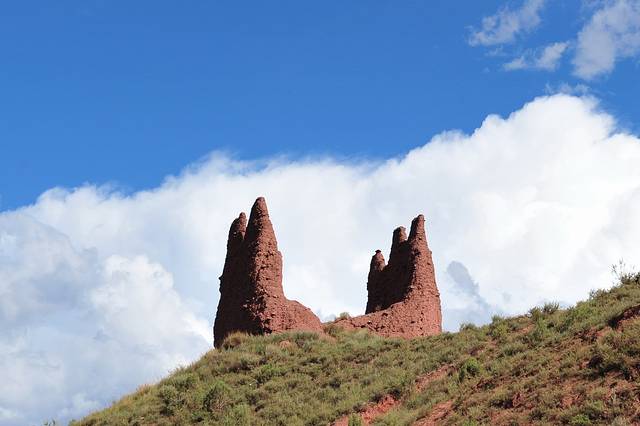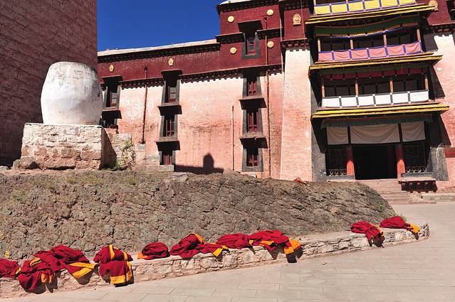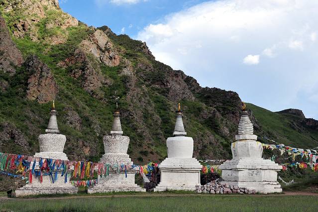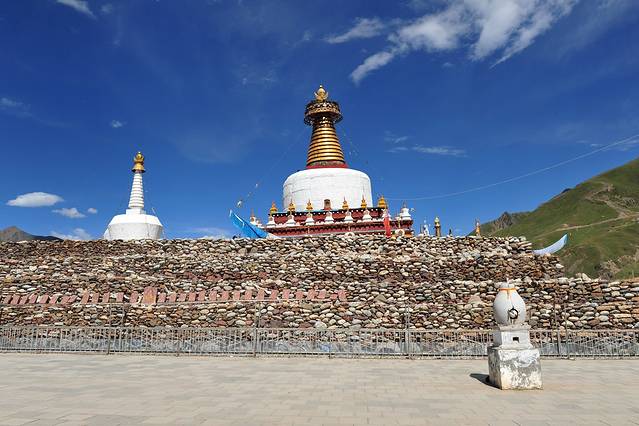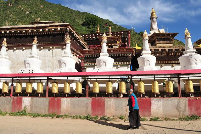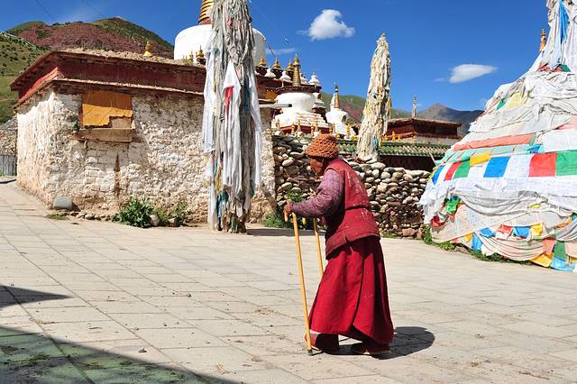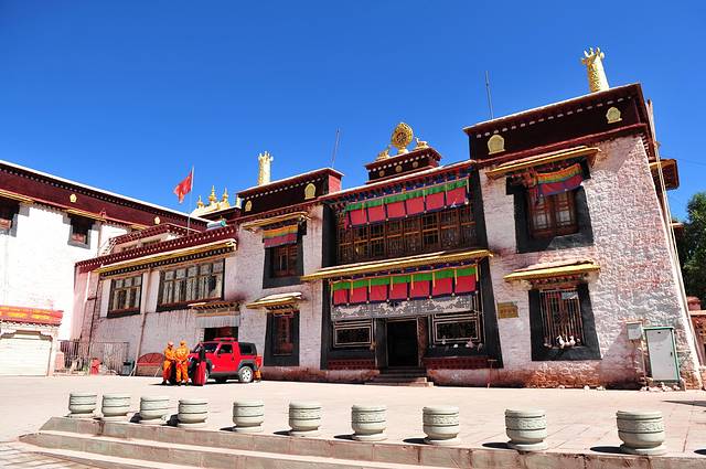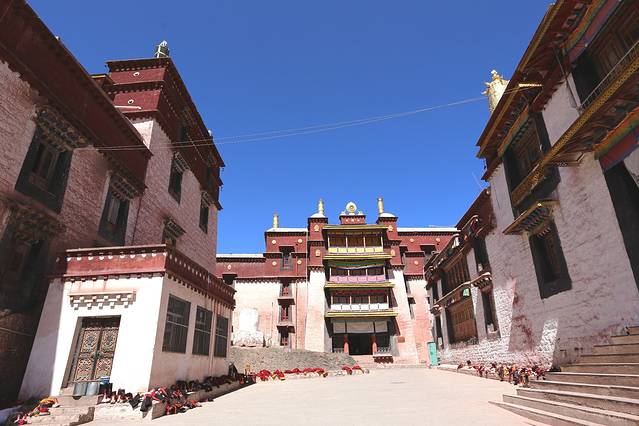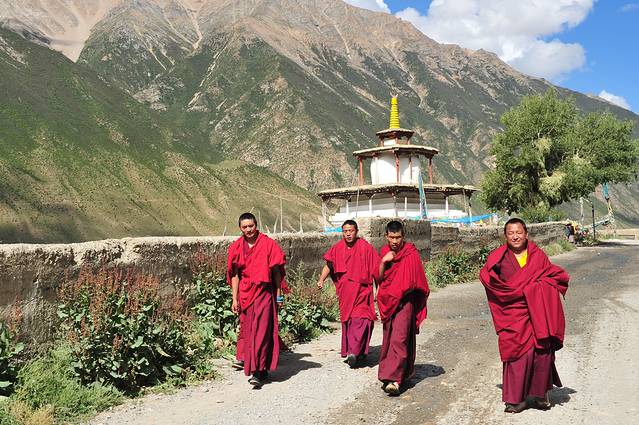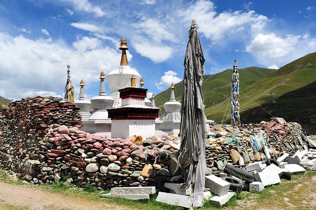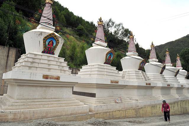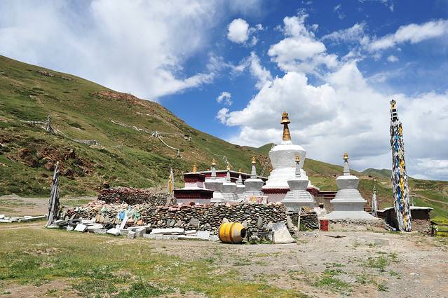 饭后继续回酒店休息,下午3点过后,太阳不那么炙热,才出门前往德格更庆寺。经过寺庙门前造型各异的白塔群。