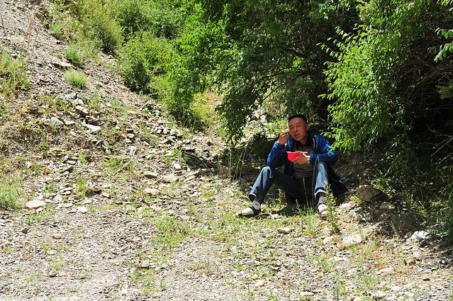 童大哥坐在树荫下悠闲地吃着自热方便饭。