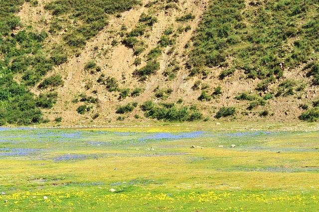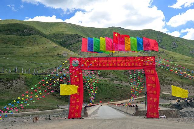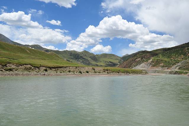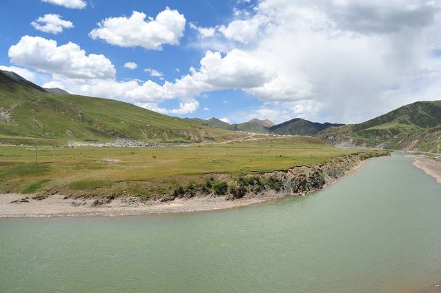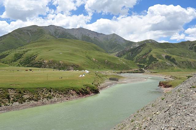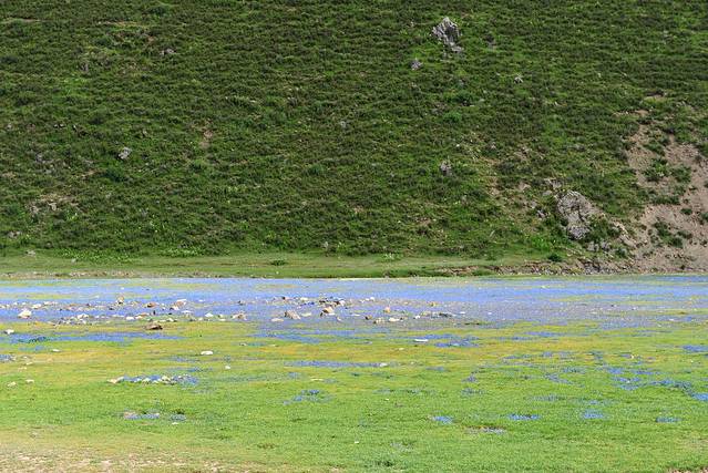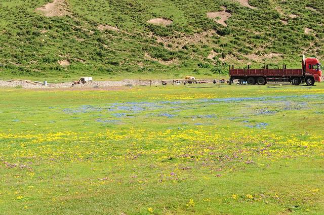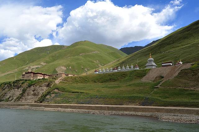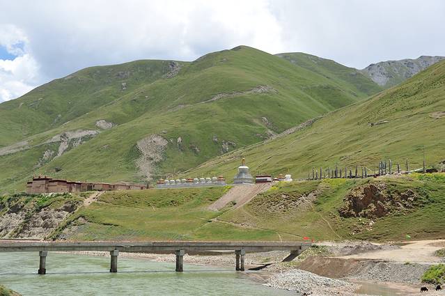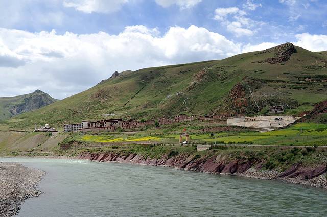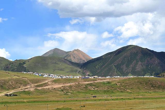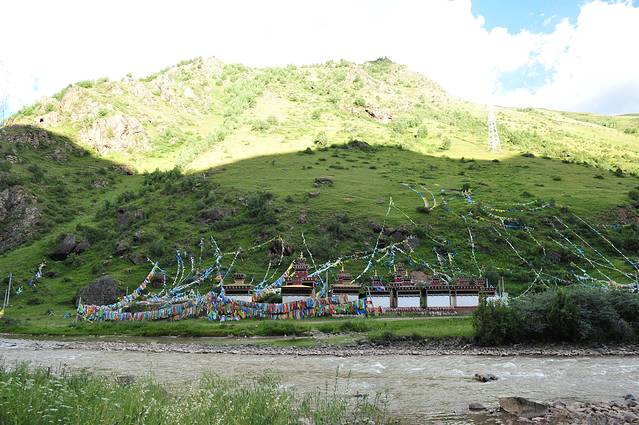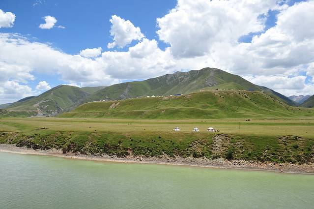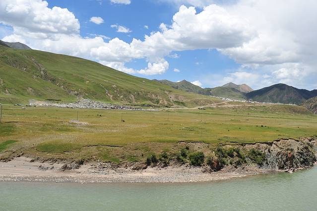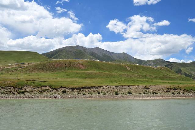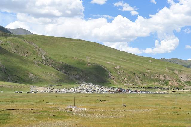 临近比如达姆寺,河对岸一片山地上,车辆与蒙古包密密麻麻,一定是在这里举行与藏民习俗有关的大型集会活动,我们想过去看看,一时找不到过河的路,只好继续前行。
