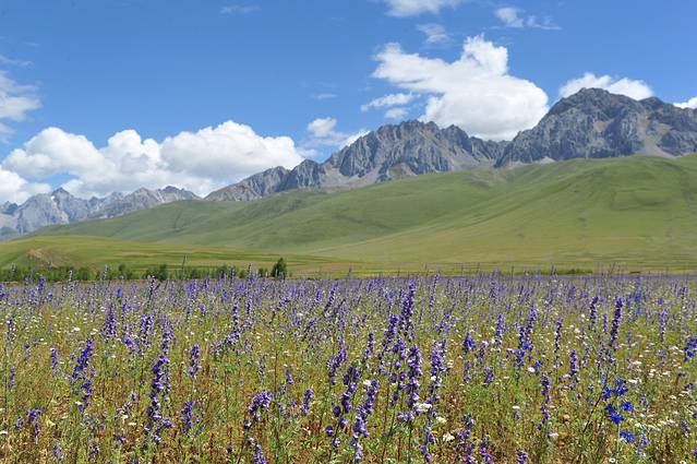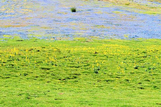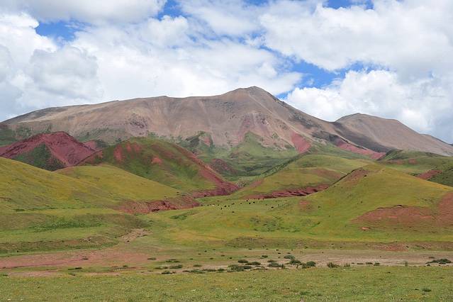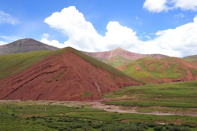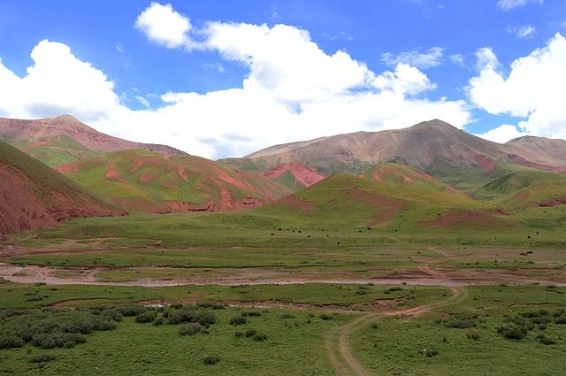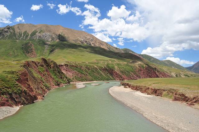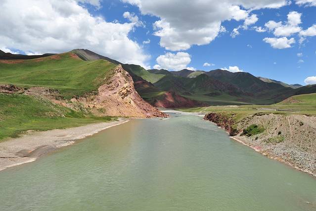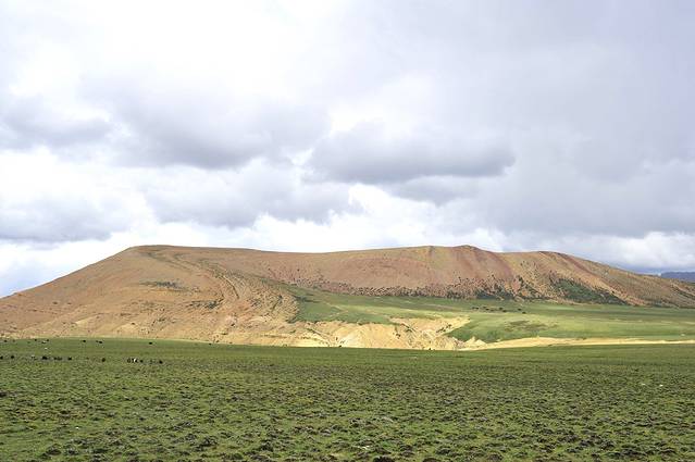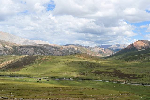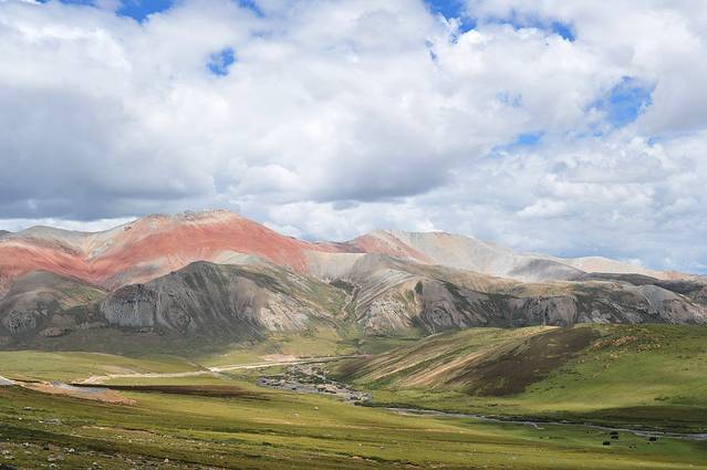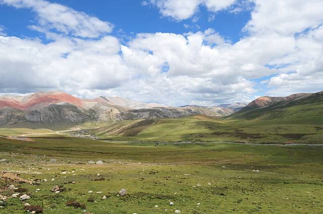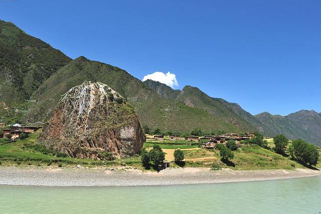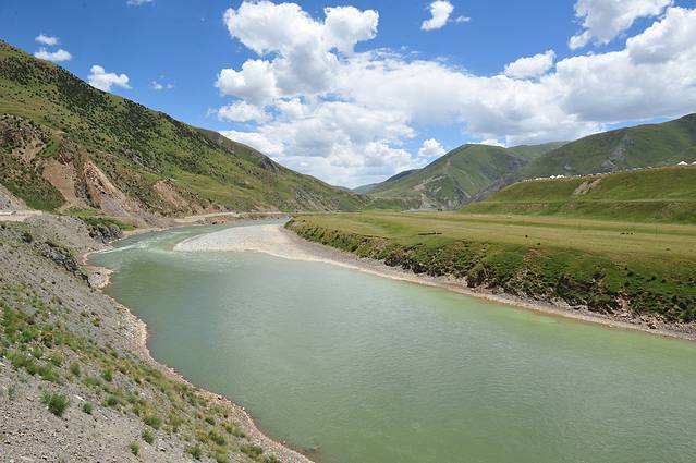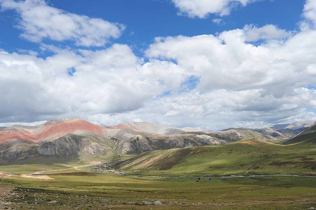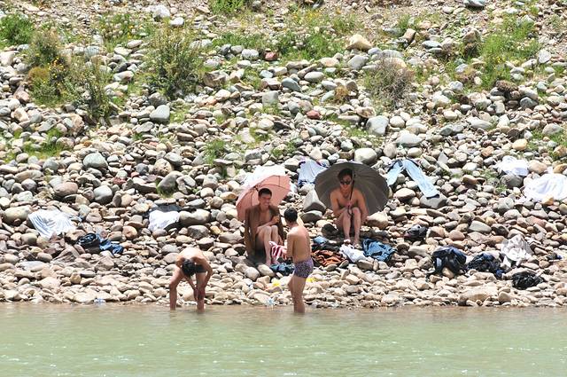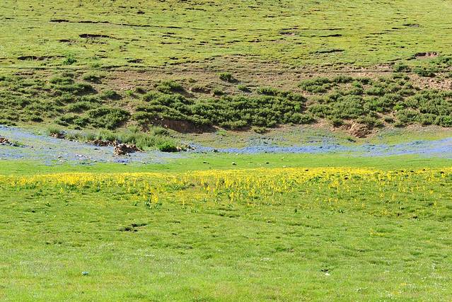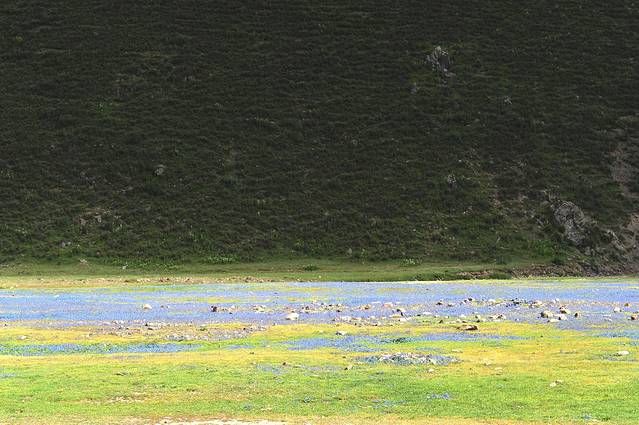 临近比如达姆寺,河对岸一片山地上,车辆与蒙古包密密麻麻,一定是在这里举行与藏民习俗有关的大型集会活动,我们想过去看看,一时找不到过河的路,只好继续前行。