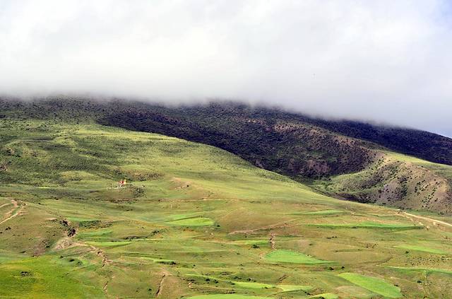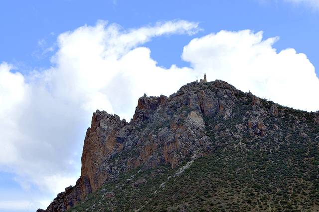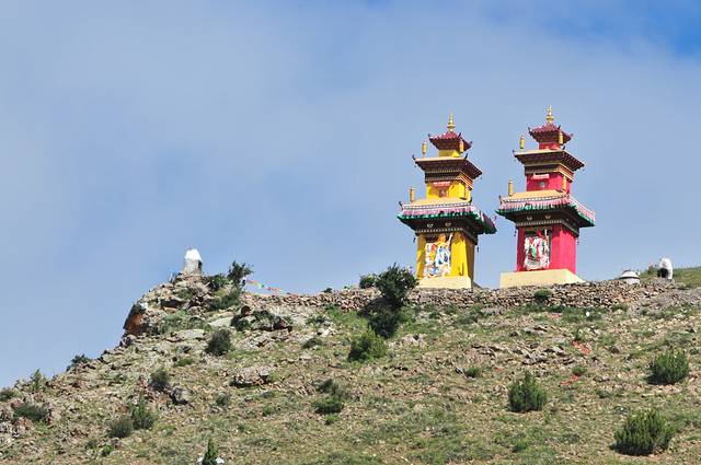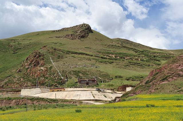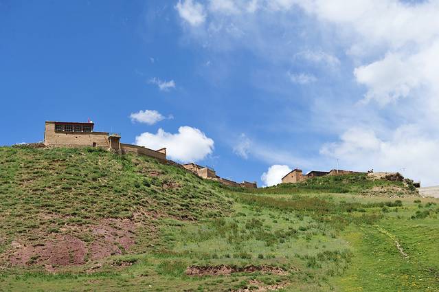公路上远望达姆寺广场平台及骷颅墙所在的天葬台小寺庙。