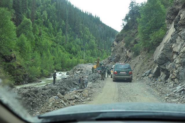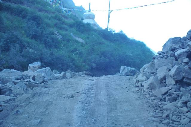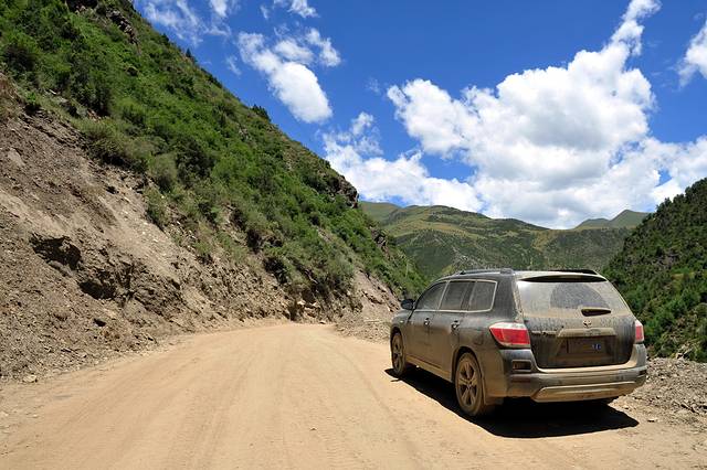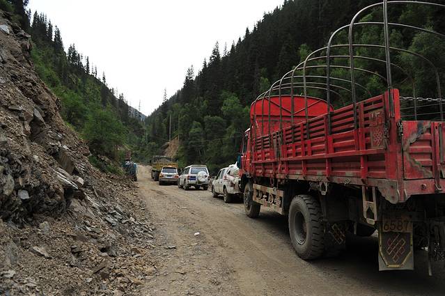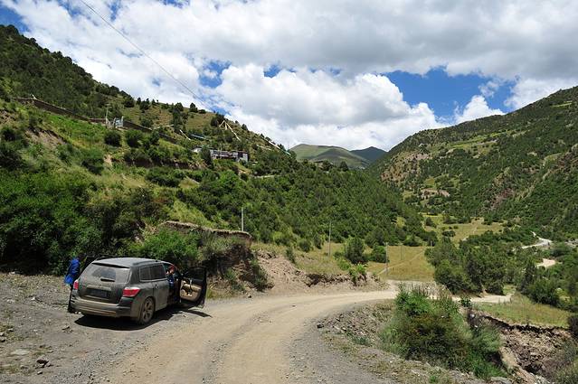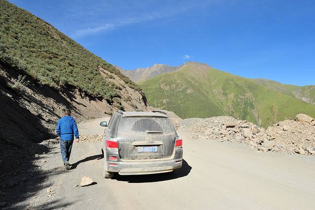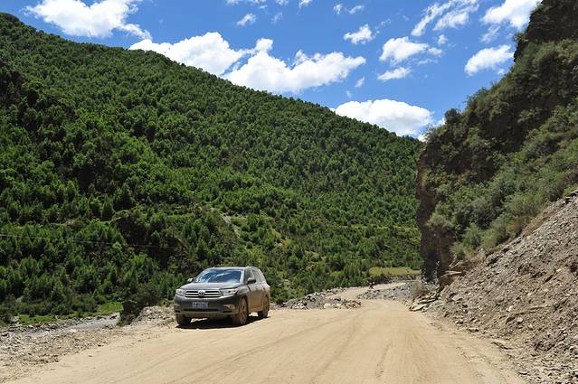 无奈只好返回到S303继续前往边坝。遇到部队的道路施工检查人员,记得西藏境内的很多危险道路,都是部队工程兵建设和维护,而这一路都是民工在修路,难道是部队把工程外包了?此时还他妈很大爷地把车停在路中间,慢吞吞地检查工程进度和质量。后面的车都过不去,我不客气地按喇叭,最后下车前去交涉,请他们把车靠边停,还好他们马上开车前行检查下一段去了,再停下来时,到是靠边停了。