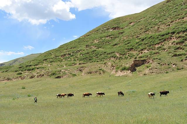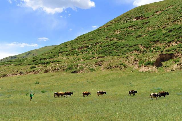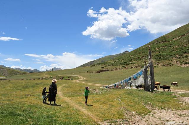 附近的山坡草地上,一位母亲带着两个孩子在放牛。