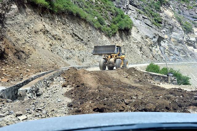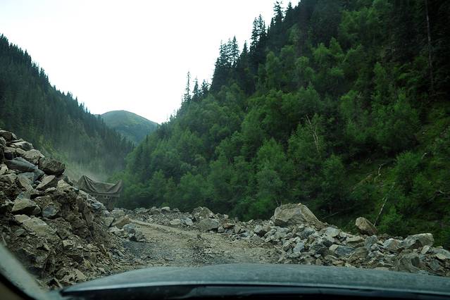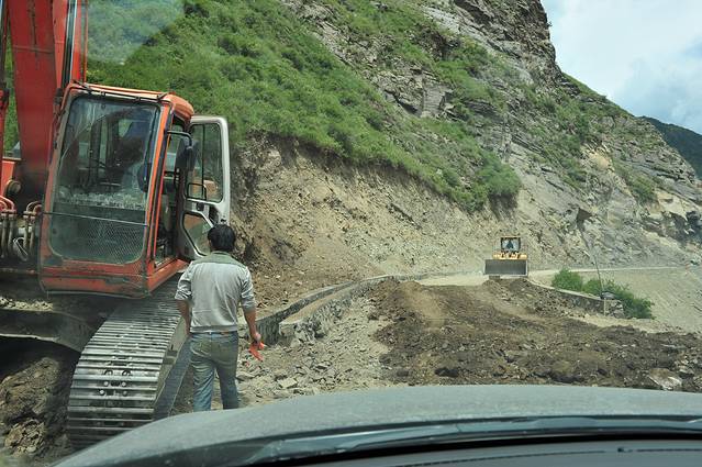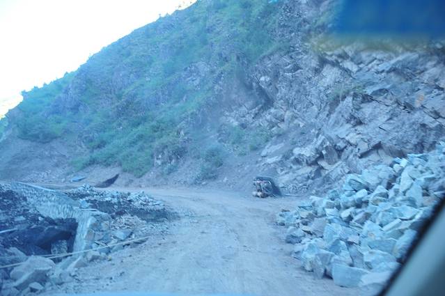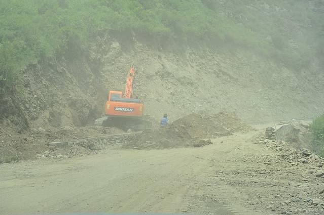 可以看到拉丁拉山口隧道施工的工地,下山的路有一段很陡,被雨水冲刷,很多大石头裸露,如果反向走,可能不一定可以上来。