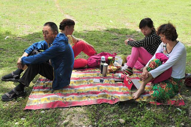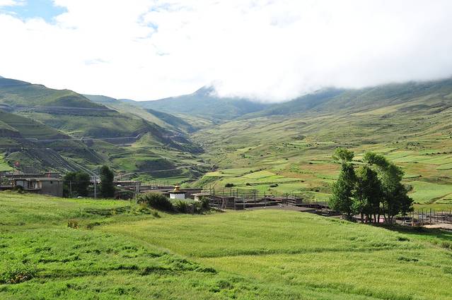 进入川西通往德格的最后两公里路在铺设沥青路面,要等到下午4点施工结束才能通过,等待的车流排起了长龙。我吗到路边的草地上纳凉休息等待,施工提前结束,不到两点就放行了,我们顺利到达德格。