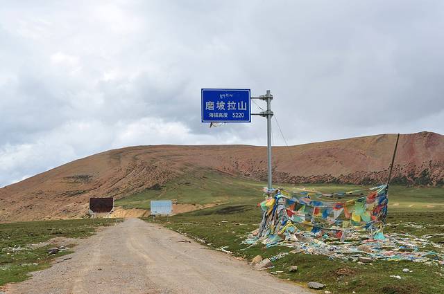 刚刚下山,看到不远处原来的老路上,也有一块磨坡拉山口路牌,标注的海拔是5220米。