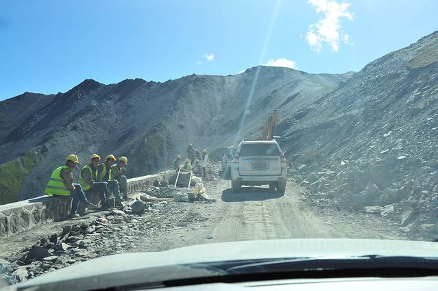 修路工人给我们行注目礼,并露出友好的微笑,我向他们表示问候,工人告诉我们此处海拔5300米。一路走过来,我们都已经适应高反,现在我们在如此高的海拔,已经没有任何反应了。