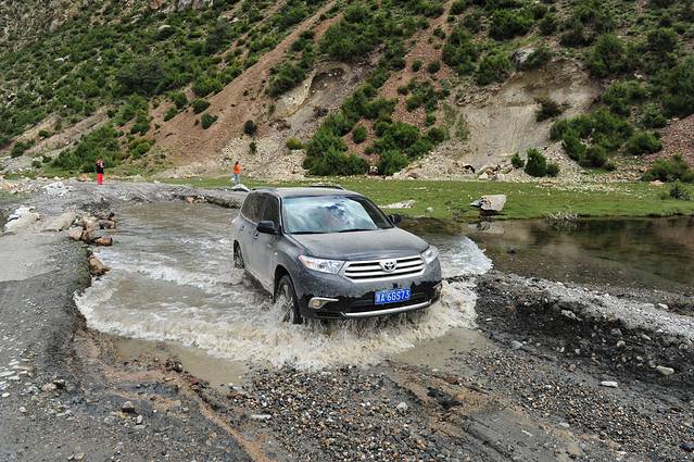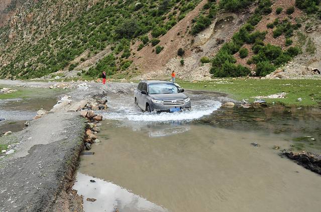 前方一个水潭,停车前去观察,往水里扔了几块石头,心里有了数,通过没有问题。其他人都下车从旁边走过,我一个人开过去。