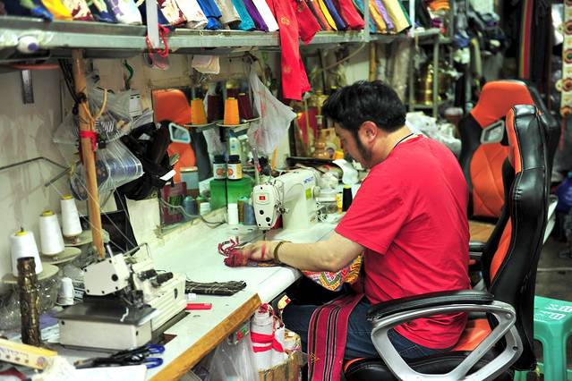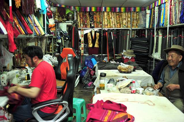 到达德格,找好住处,外出吃饭,酒店边上一家做藏衣的裁缝店,男主人熟练地踩着缝纫机。