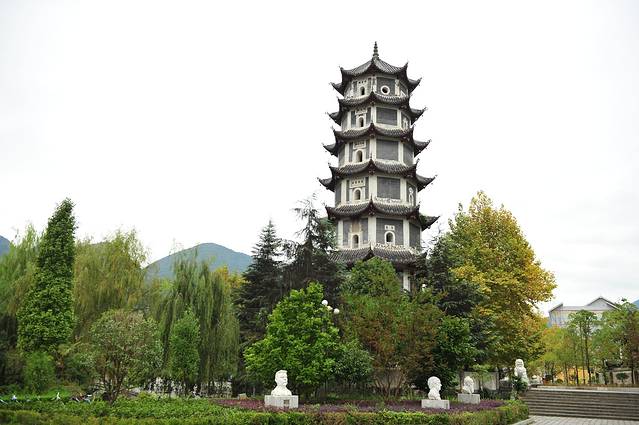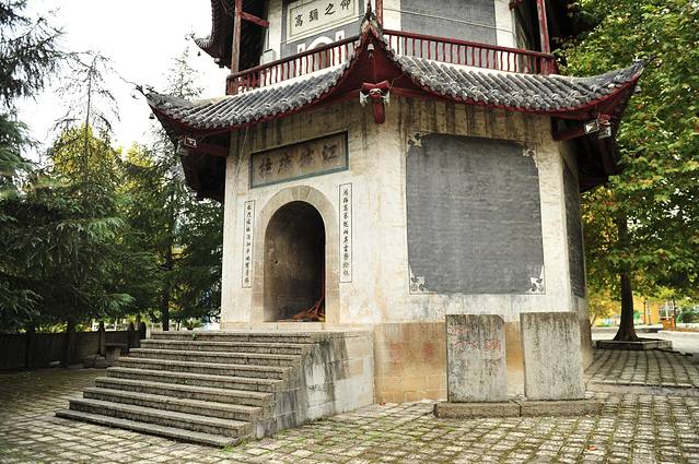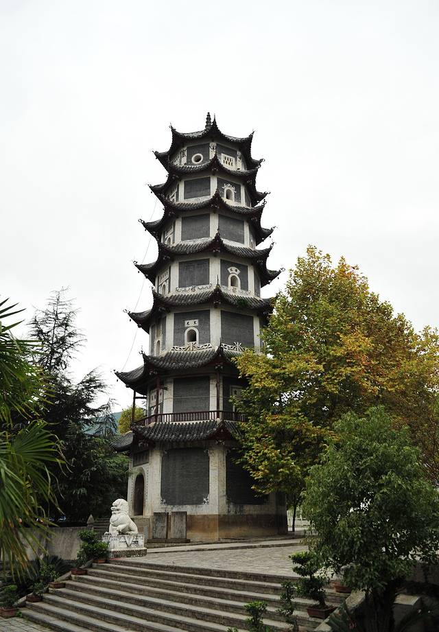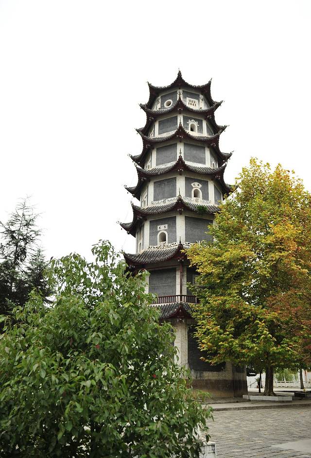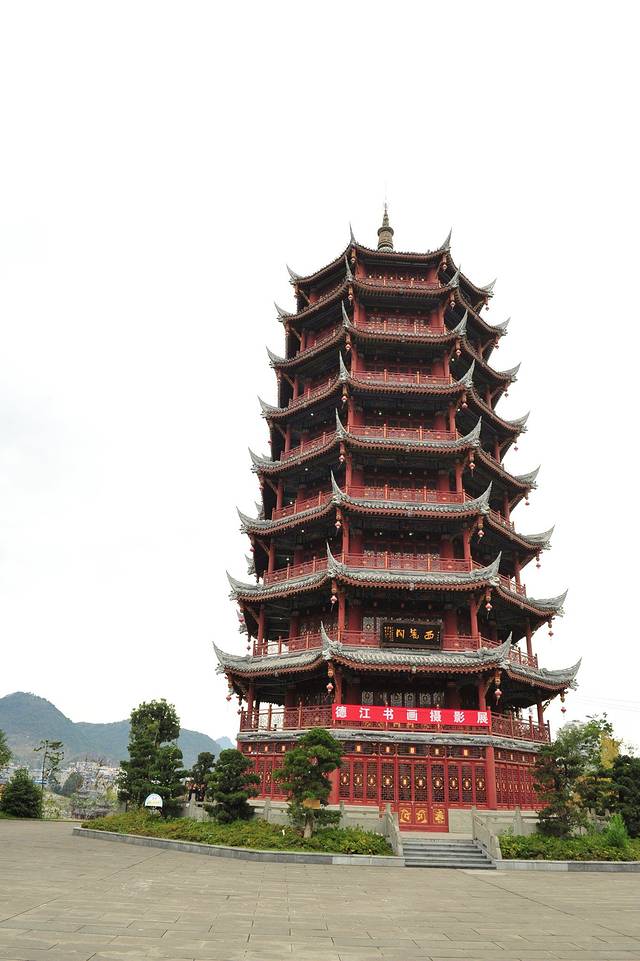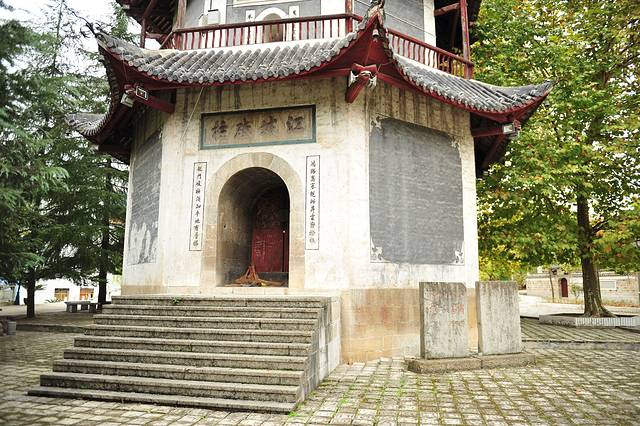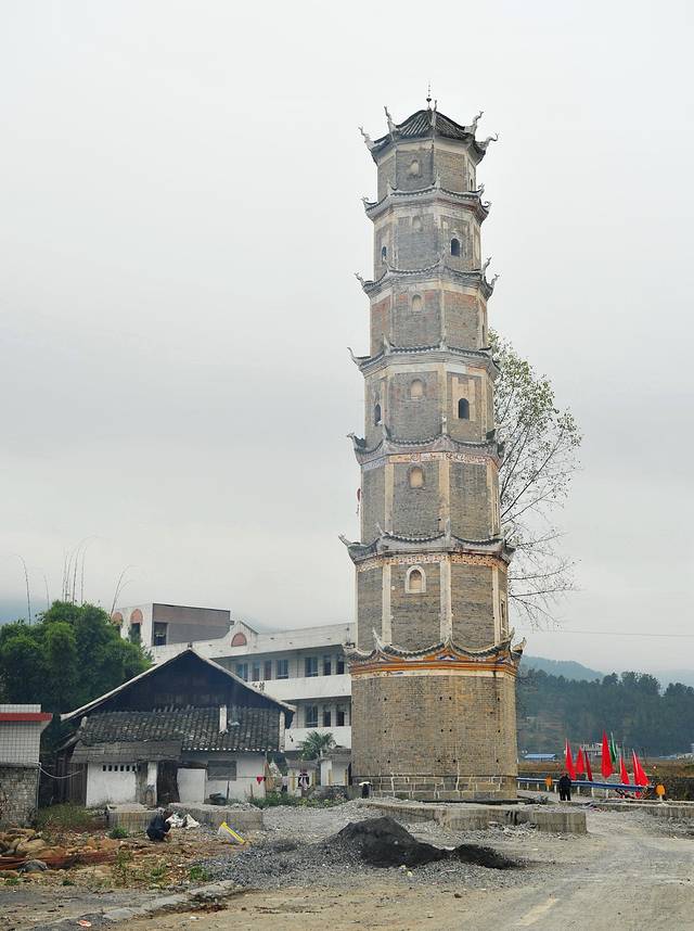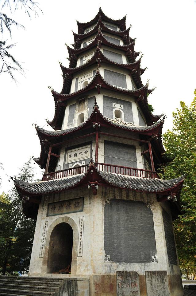 位于印江中寨中学的文昌阁,始建于明崇祯二年(1629年),初名“澄清楼”。清康熙十七年(1687年)重建,更名“文昌阁”,后毁。清道光十七年(1837年)再建。印江文昌阁坐西向东,七层八角攒尖顶式,飞檐翘角,通高37.8米,占地面积64平方米。
