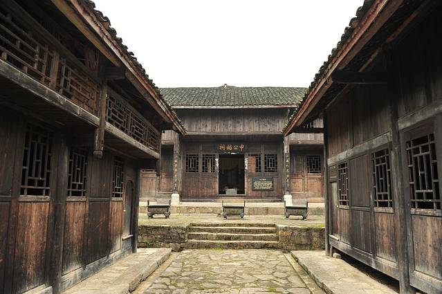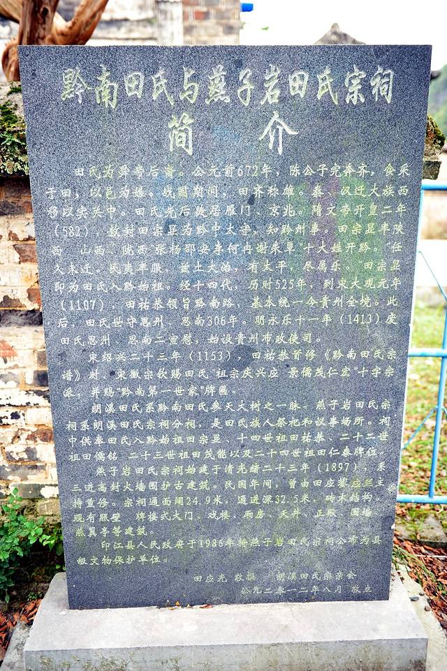 网上资料介绍:田氏宗祠占地约2千余平方米,外有风火围墙,一楼一底的砖木结构,内为小四合院,楼上设有跑道、瞭望窗,外墙有花池,甬墙有石壁雕镂篆刻,正面墙柱上的三副对联由大学士田应丰所撰,书法家、印江县长潘永衡所书。院角两颗紫荆,虬枝交错,与古祠相得益彰。