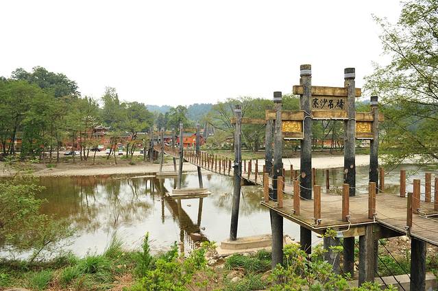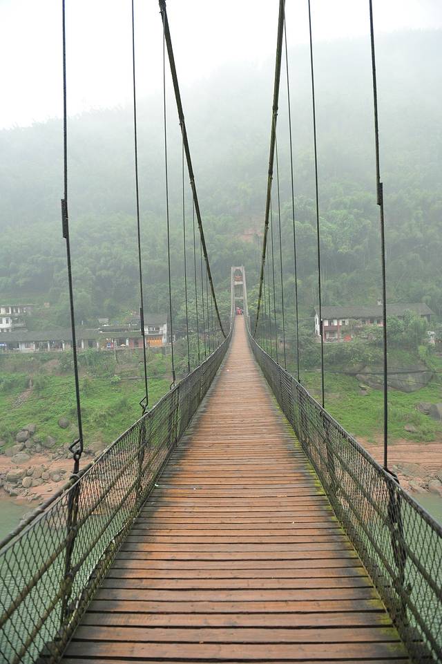 阴雨中到达丙安古镇,把车子停在公路边的停车场,过吊桥进入古镇。